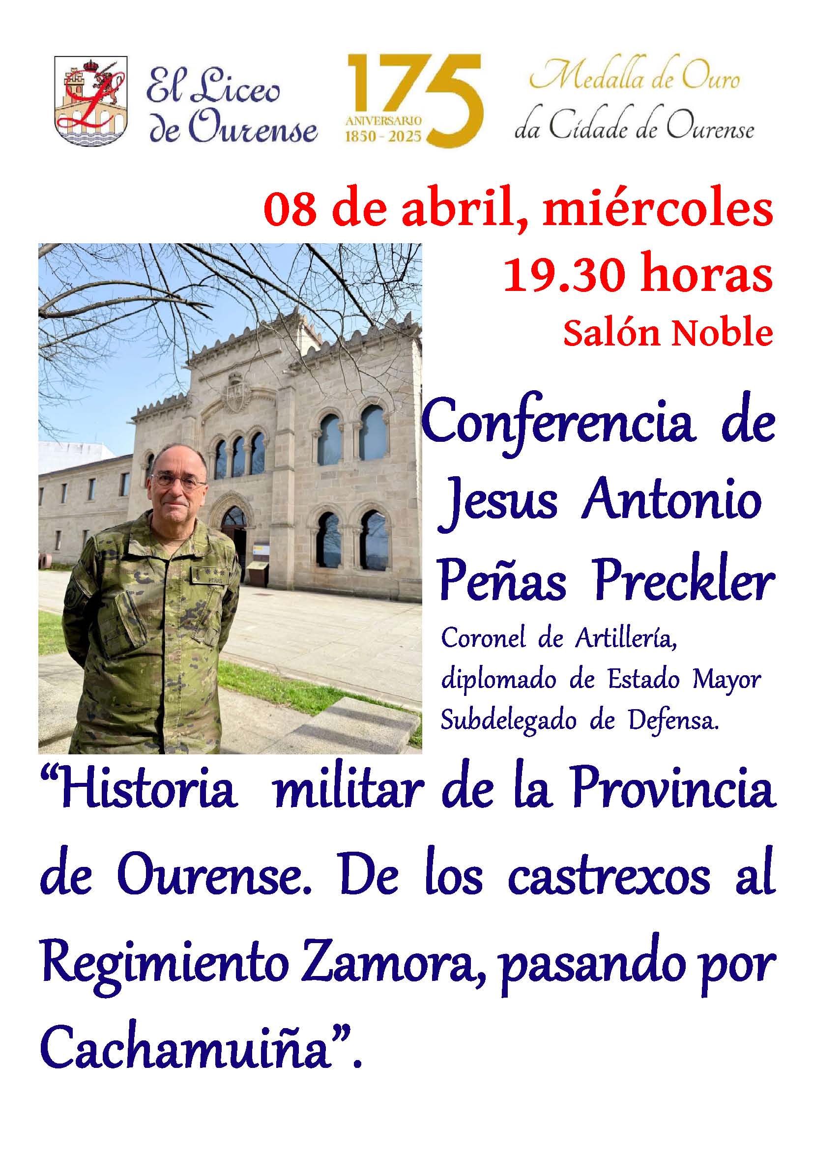 Magnífica conferencia de D. Jesus Antonio Peñas Preckler, Coronel de Artillería, diplomado de Estado Mayor ,Subdelegado de Defensa, con el título “Historia militar de la Provincia de Ourense. De los castrexos al Regimiento Zamora, pasando por Cachamuiña”. Una disertación muy amena y divulgativa sobre la historia militar ourensana, partiendo de los Castrexos de San Cibrao de Las, Castromao, Satomé, Armeá, pasando por los Romanos y las Batallas «do esquecemento», Folión en Castromao, AquaQuerquénis; El ejercito inglés en Ourense con el Duque de Lancaster, la Creación del Tercio Zamora 8 y la lucha en Flandes; El Milagro de Empel, La guerra de la Restauración de Portugal; la Guerra de la Sucesión Española en 1715; la Guerra de la Independencia contra los franceses con un personaje tan interesante como el Comandante Cachamuiña, la puesta en marcha del Cuartel de San Francisco, en fin un recorrido amplio de toda la historia militar en Ourense. Muchas gracias Jesús por tu intervención en el Liceo, seguro que habrá muchas más.